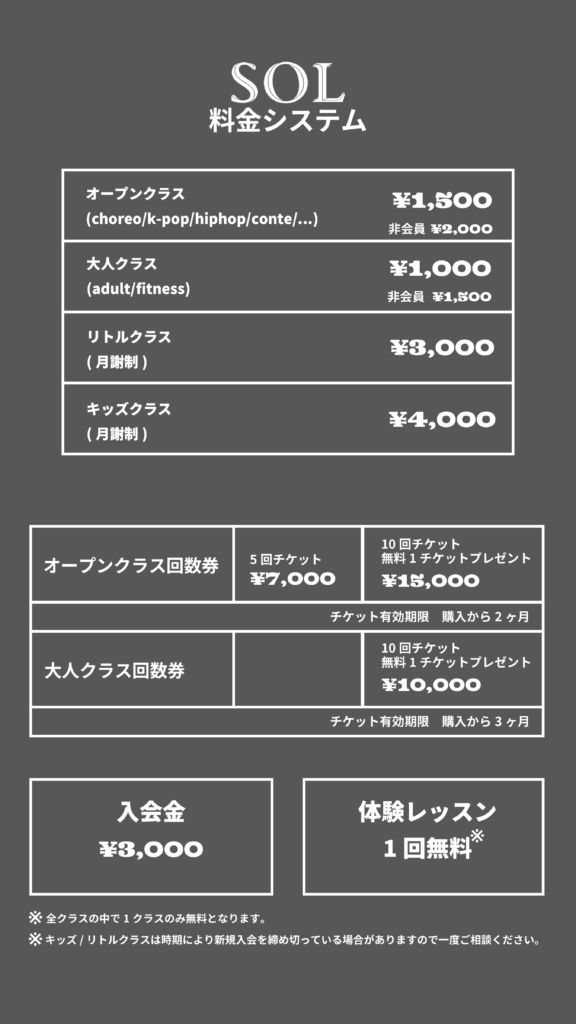 会場の関係でレッスン時間やレッスン会場の変更になる場合もありますので公式インスタグラムをチェックしてください。